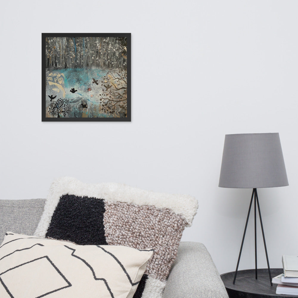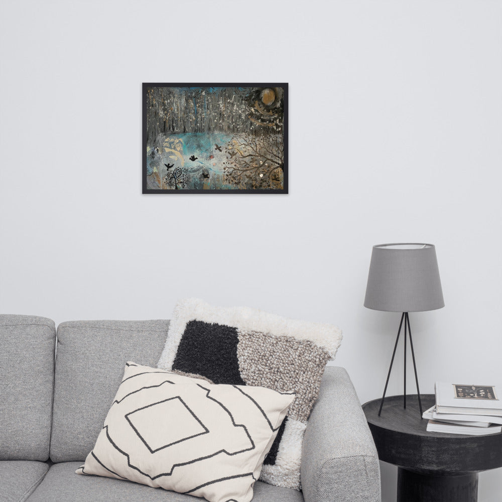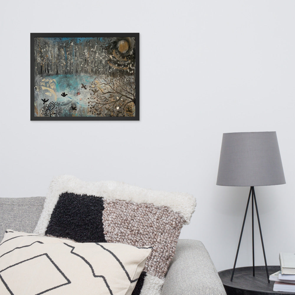 This painting represents the beauty and chaos of life, love and renewed strength. The common color theme is blue, black, greys and silvers.